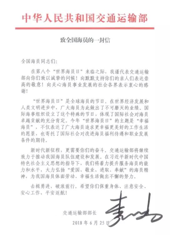 交通運輸部部長李小鵬致信慰問全體海員。25日,中國籍民用船舶、中國航運企業(yè)擁有或光租的非中國籍船舶將掛滿旗慶祝。在國外部分港口,中國駐地使領館將派員登輪慰問在港停泊的中國海員。此外,交通運輸部海事局與中國海員建設工會共同組織開展了大規(guī)模的“2018年媒體走近海員”新聞采訪活動,22名媒體記者分乘6艘船舶,和海員同吃同住同工作,身臨其境,現(xiàn)場報道,向社會展現(xiàn)當代中國海員的風采。